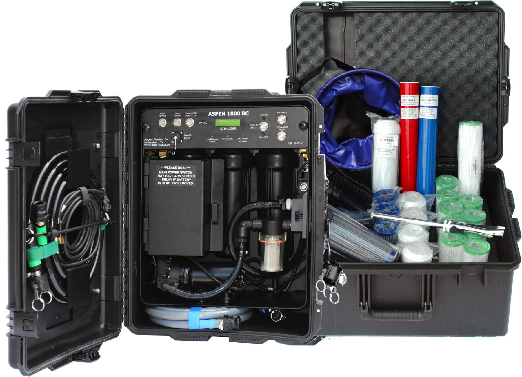 (Brief Case) is packaged in a Pelican carrying case. The water purification systems supplies up to 1,800 gallons per day (75 gallons per hour) of highly purified water from virtually any non-saline water source. Water can be drawn from ditches, ponds, rivers, lakes or standing water that may contain chemical or biological contamination.